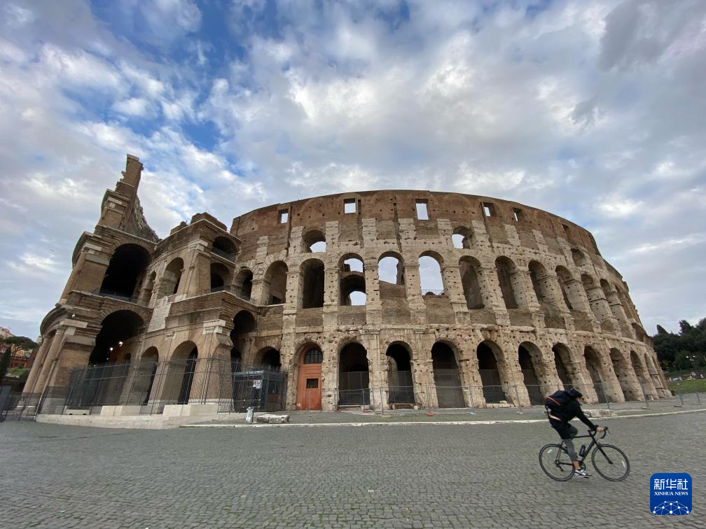 2020年12月29日,一名男子骑车从意大利罗马的斗兽场经过(手机照片)。