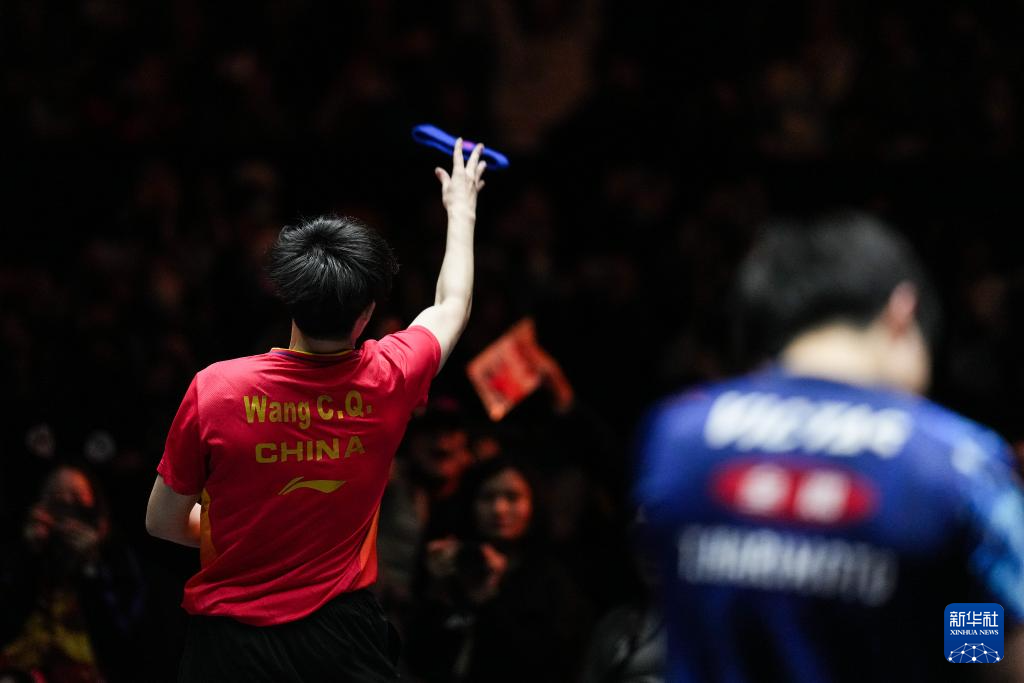 11月24日,中国选手王楚钦在比赛后将发带扔给观众庆祝胜利。