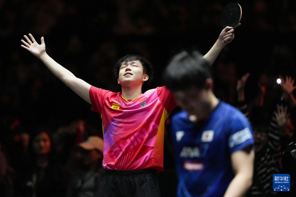 11月24日,中国选手王楚钦(左)在比赛后庆祝胜利。