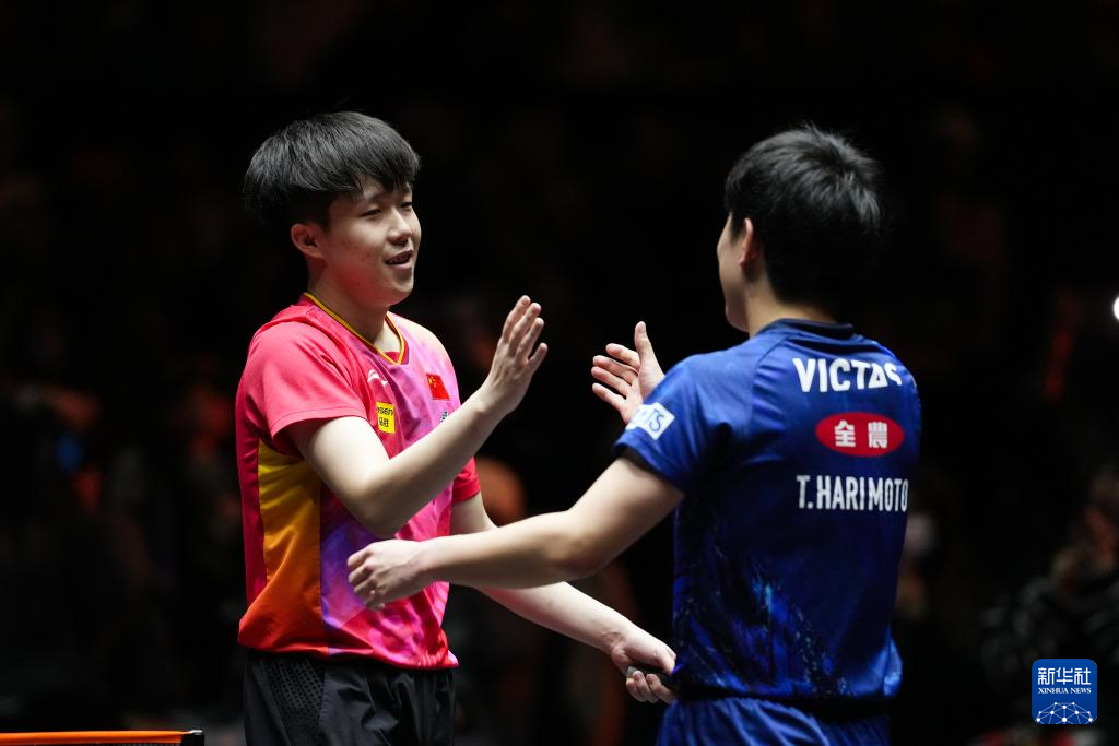11月24日,中国选手王楚钦(左)在比赛后与日本选手张本智和相互致意。