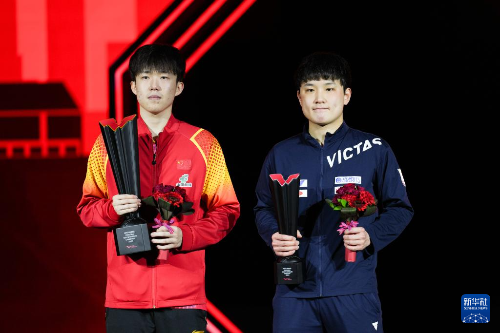 11月24日,中国选手王楚钦(左)和日本选手张本智和在颁奖仪式上。