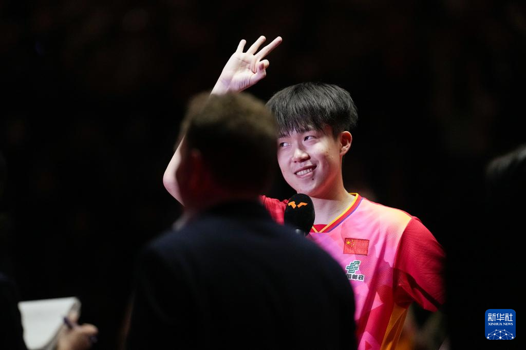 11月24日,中国选手王楚钦在比赛后接受采访示意自己总决赛男单三连冠。