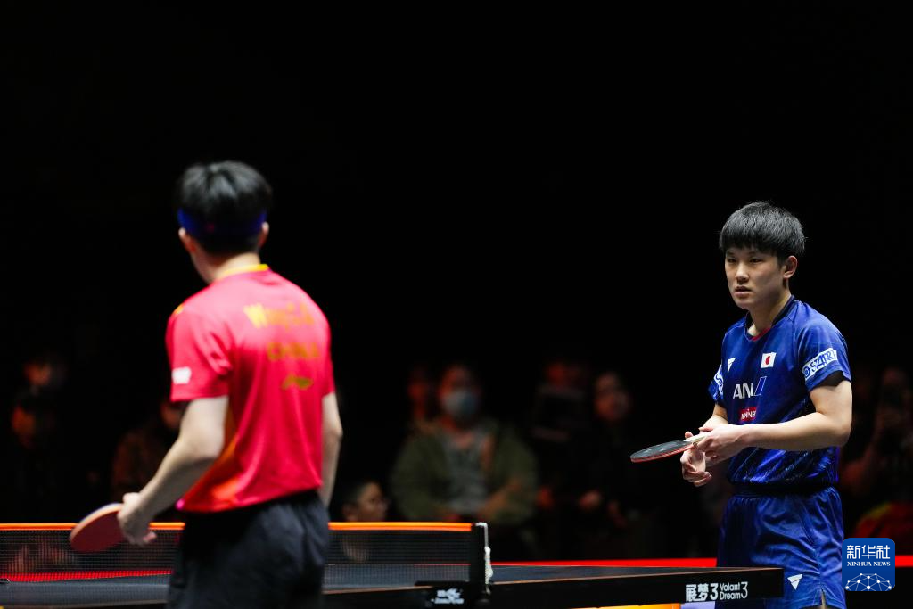 11月24日,日本选手张本智和(右)在比赛中。