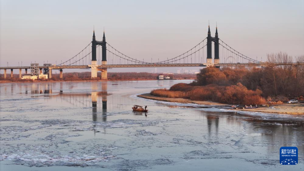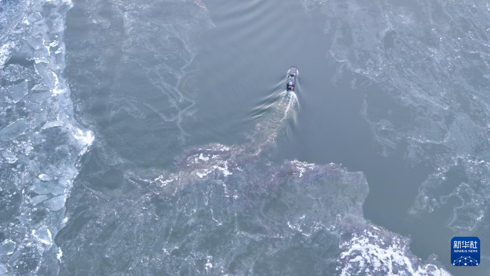 11月24日,在松花江哈尔滨段,一艘小船从流冰旁经过(无人机照片)。