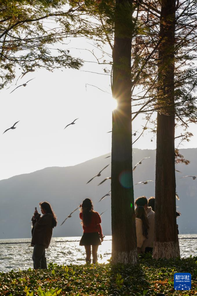 11月24日,游客在昆明市海洪湿地公园的水杉林旁观赏红嘴鸥。