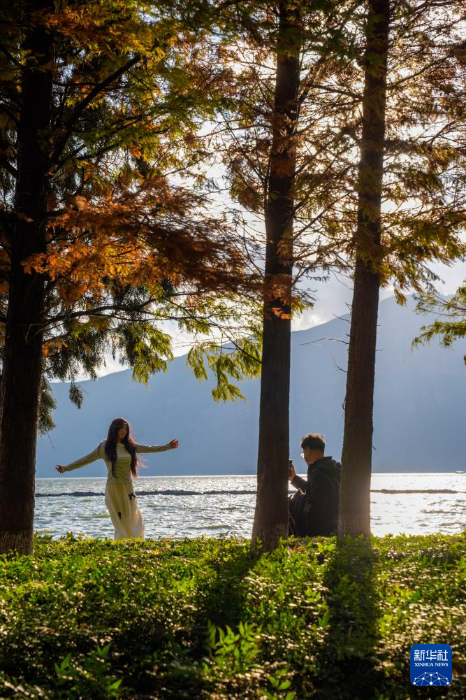 11月24日,两名游客在昆明市海洪湿地公园的水杉旁拍照。