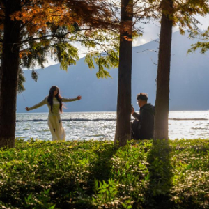 11月24日,两名游客在昆明市海洪湿地公园的水杉林拍照。