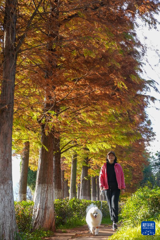 初冬时节,云南省昆明市海洪湿地公园的水杉迎来观赏季,不少游客前往观光游玩。