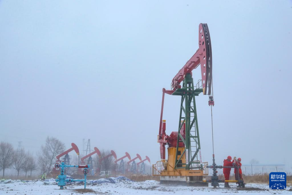 11月25日,在黑龙江大庆油田一处采油平台,石油工人在雪中作业。