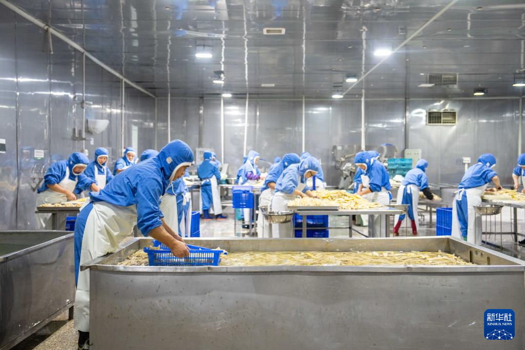 11月27日,工人在桃江县马迹塘镇笋竹特色产业园内一家鲜笋加工企业生产车间加工鲜笋。