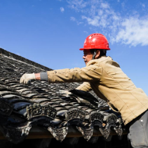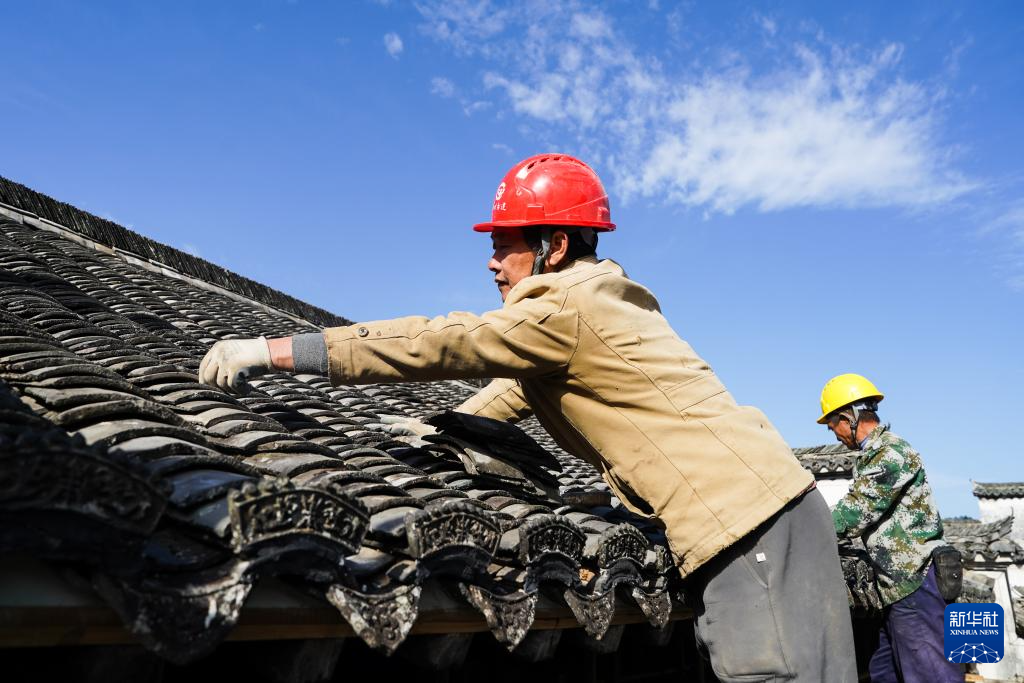 11月26日,维修工人在黄山市黟县西递村追慕堂对房屋瓦片进行整理。