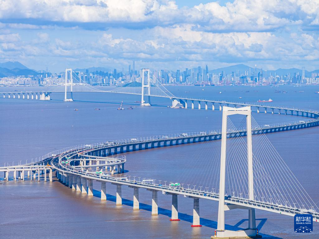 车辆行驶在深中通道上(2024年7月3日摄,无人机照片)。深中通道全长约24公里,集“桥、岛、隧、水下互通”于一体,是世界上综合建设难度最高的跨海集群工程之一。