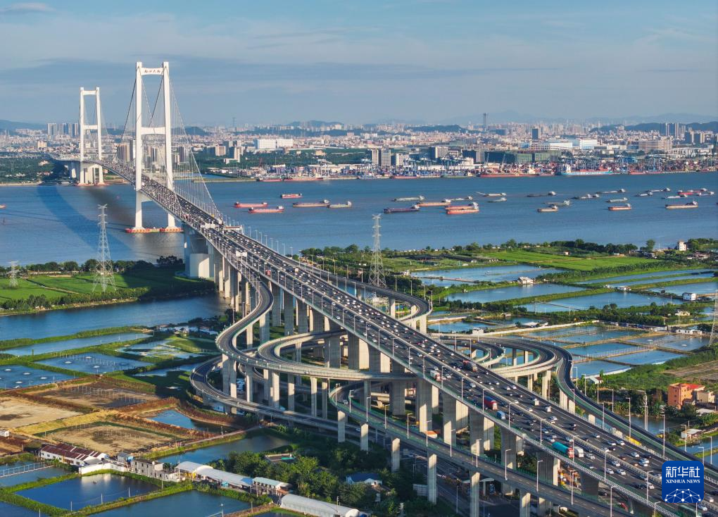 南沙大桥全景(2022年6月29日摄,无人机照片)。南沙大桥跨珠江口狮子洋水域,连接广州市南沙区东涌镇、番禺区海鸥岛和东莞市沙田镇。