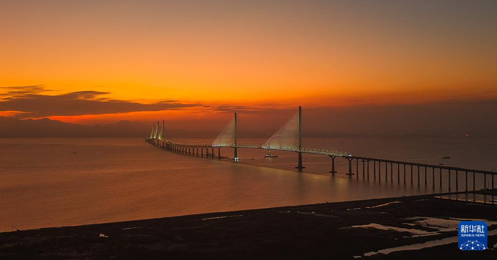 夕阳下的高栏港大桥(左侧双主塔)和黄茅海大桥(右侧三主塔)(2024年12月4日摄,无人机照片)。黄茅海跨海通道始于珠海高栏港,终于江门台山斗山镇,横跨珠江口崖门入海口黄茅海水域,线路全长约31公里,其中跨海段主要由高栏港大桥和黄茅海大桥组成。