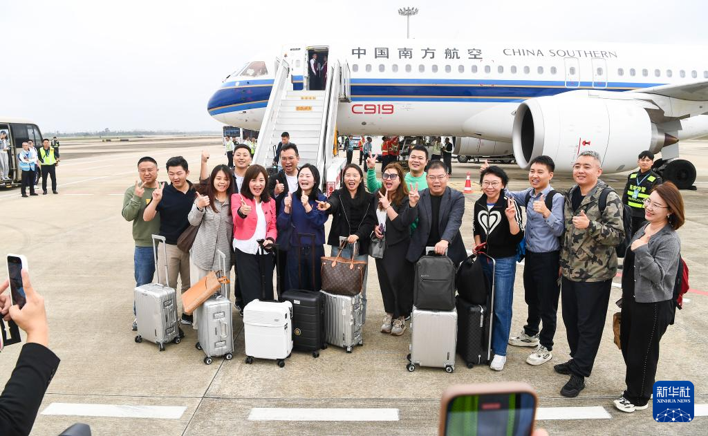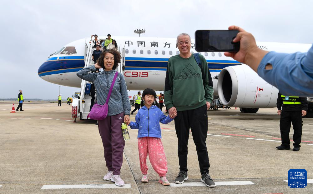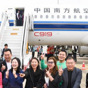 12月11日,旅客下飞机后同国产大飞机C919合影留念。