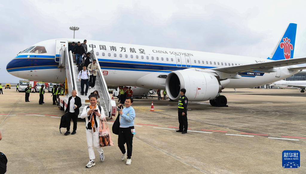 12月11日,在海口美兰国际机场,旅客走下由C919执飞的中国南航CZ6786航班。