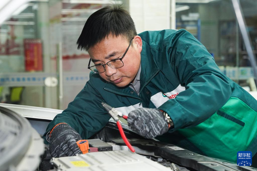 12月9日,赵飞在合肥荣创汽车服务有限公司修理新能源汽车。