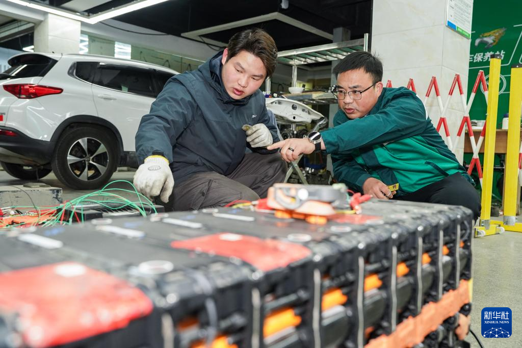 12月9日,赵飞(右)在合肥荣创汽车服务有限公司与同事一起做电池均衡。