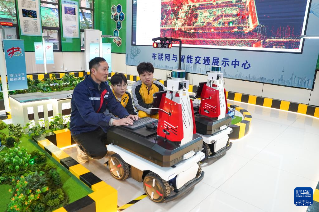 12月10日,在安徽万通技师学院车联网与智能交通展示中心,郑飘雪(中)、王文韬(右)在老师汪贵的指导下调试自动驾驶车辆。