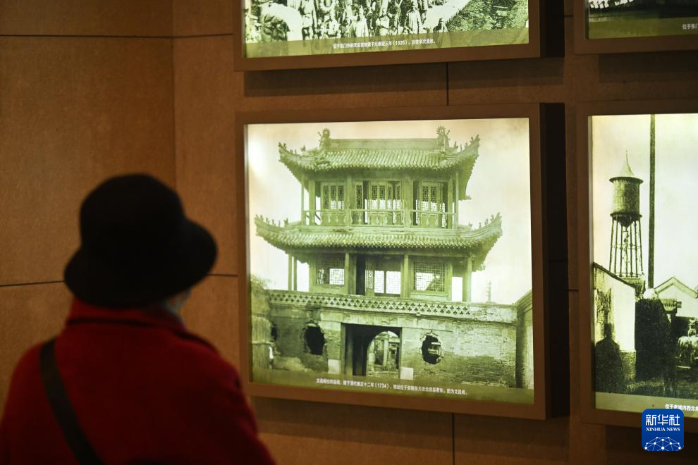 一名曾居住在天津老城厢的市民在天津鼓楼博物馆参观(12月17日摄)。