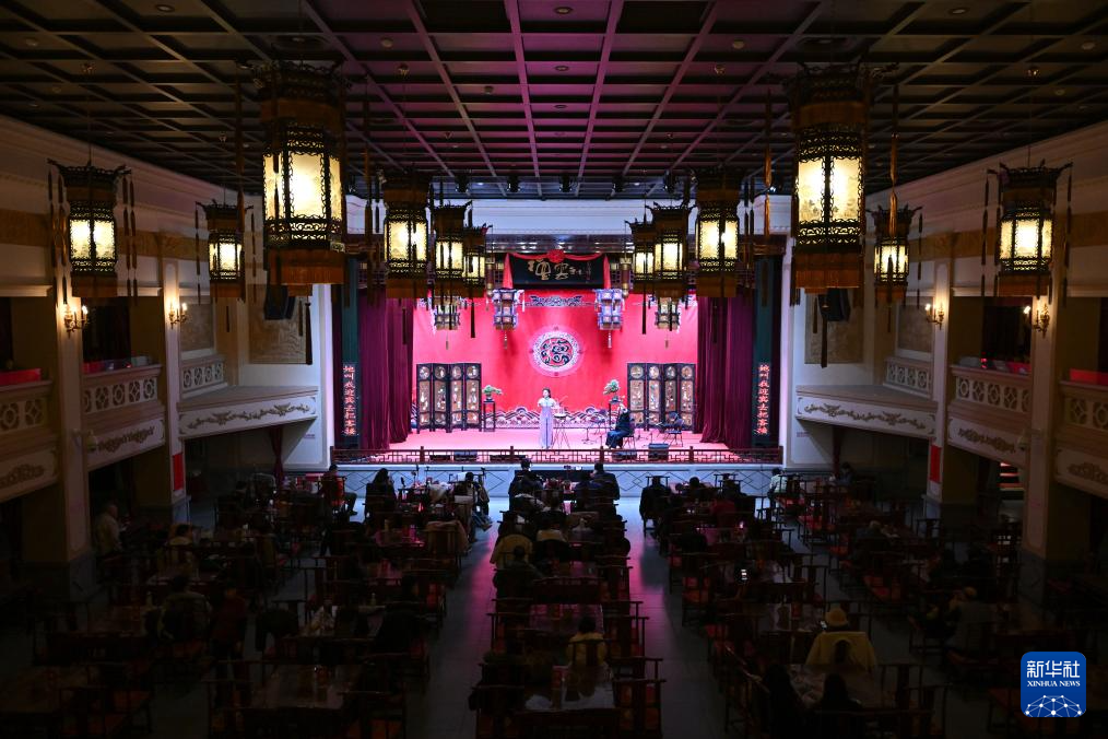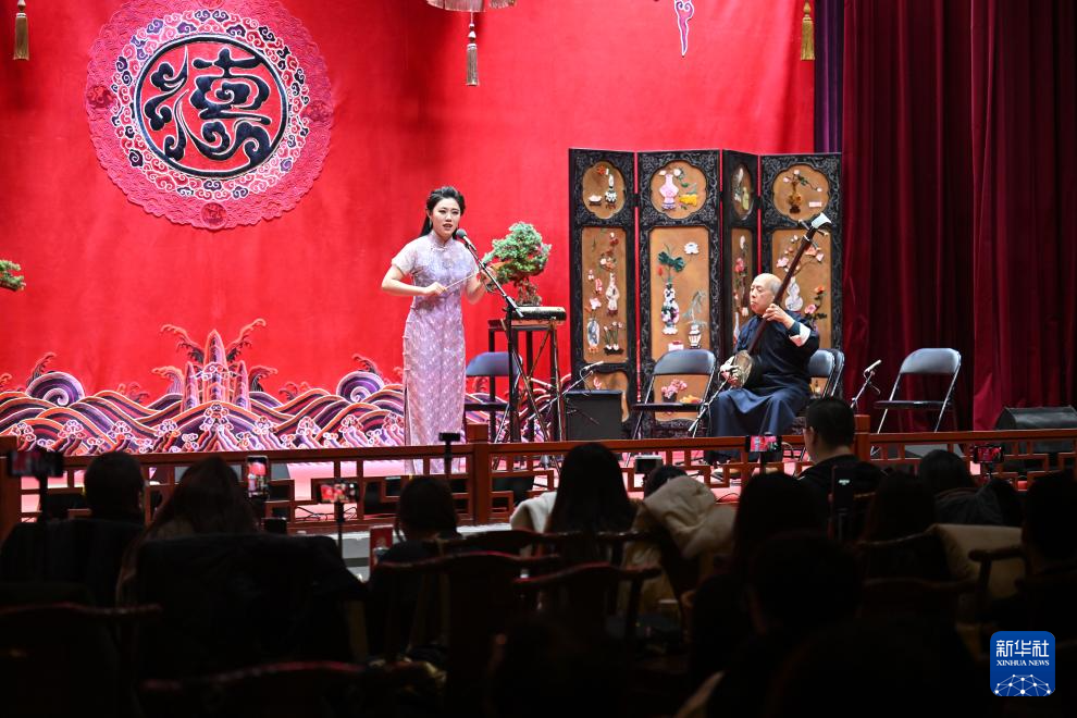 市民在天津德云社观看鼓曲演出(12月21日摄)。
