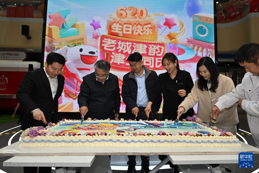 市民及专家学者在位于天津南开区的一家商场内为城市庆生切蛋糕(12月22日摄)。