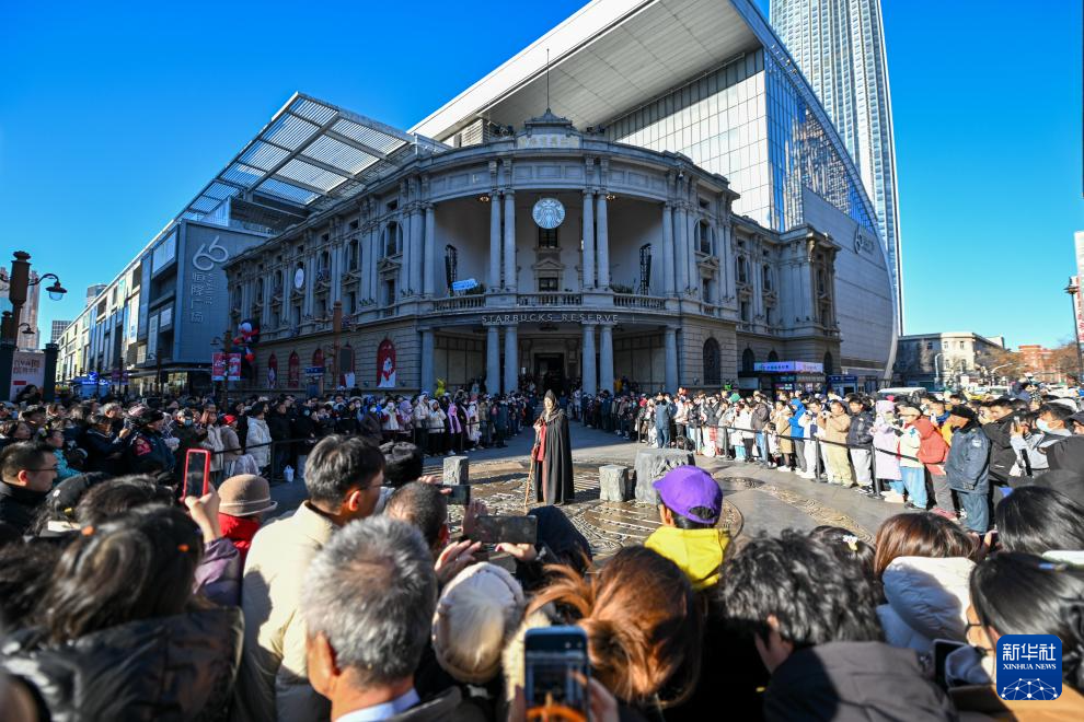 市民游客在天津金街大铜钱广场观看天津人民艺术剧院带来的沉浸式戏剧演出(12月21日摄)。