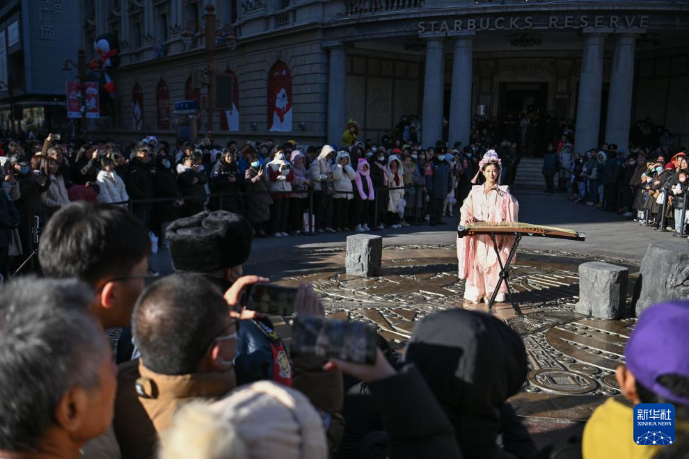 古筝表演者在天津金街步行街大铜钱广场演出(12月21日摄)。