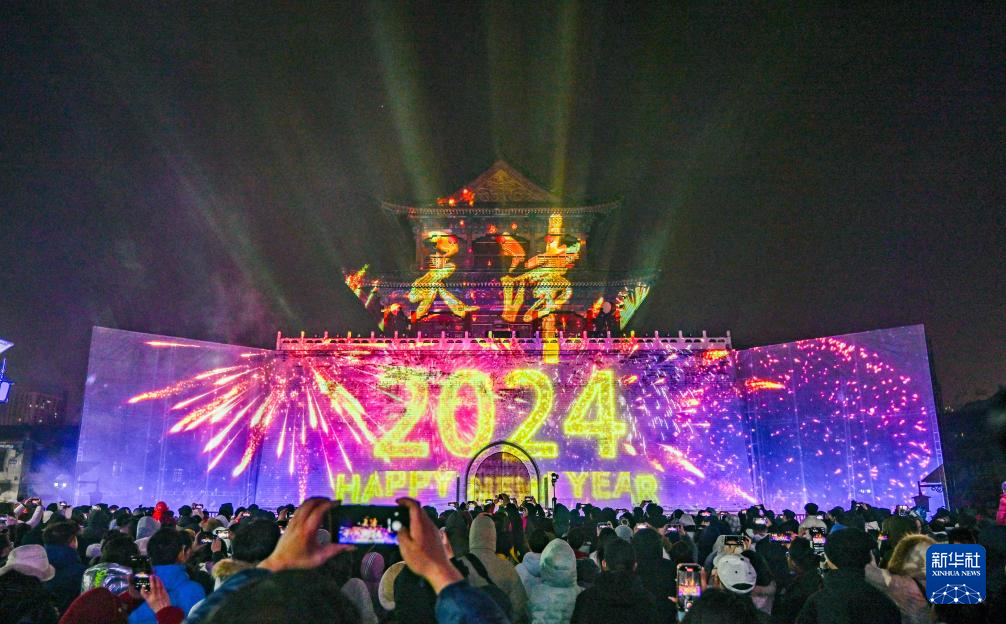 市民游客在天津鼓楼观看跨年灯光秀(1月1日摄)。