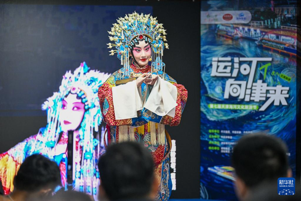 戏曲表演者在海河游船上为游客演出(3月28日摄)。