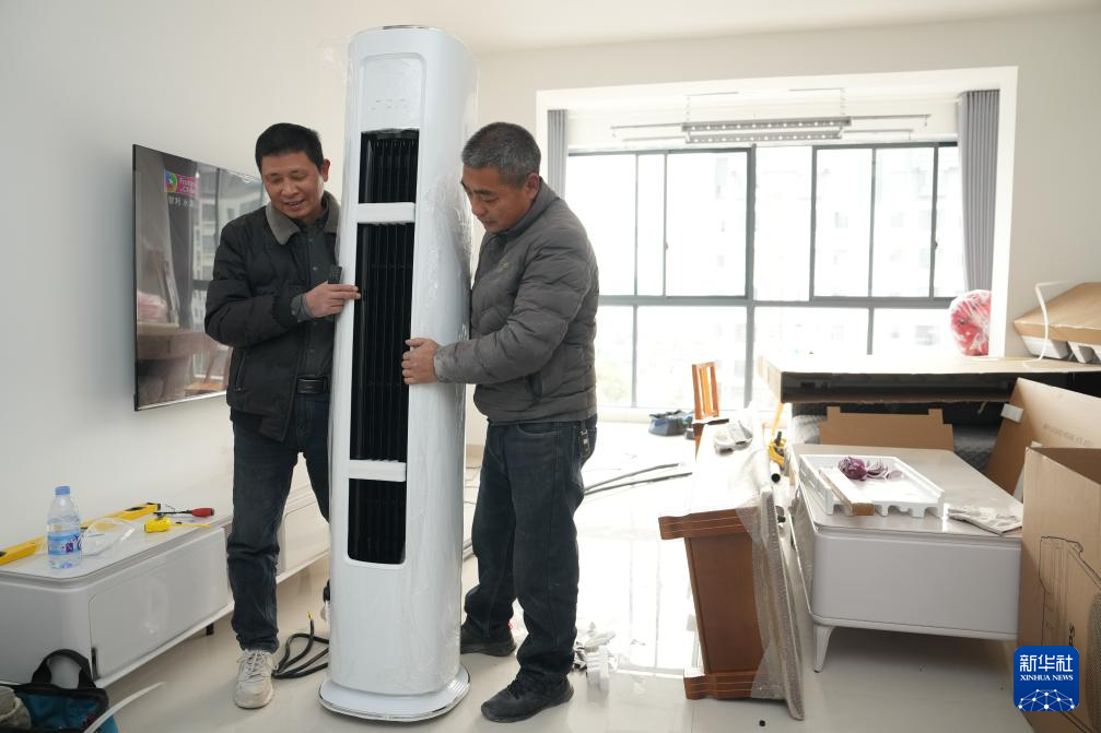 12月25日,在“团洲新村”,工人们在马首富的家中安装空调。