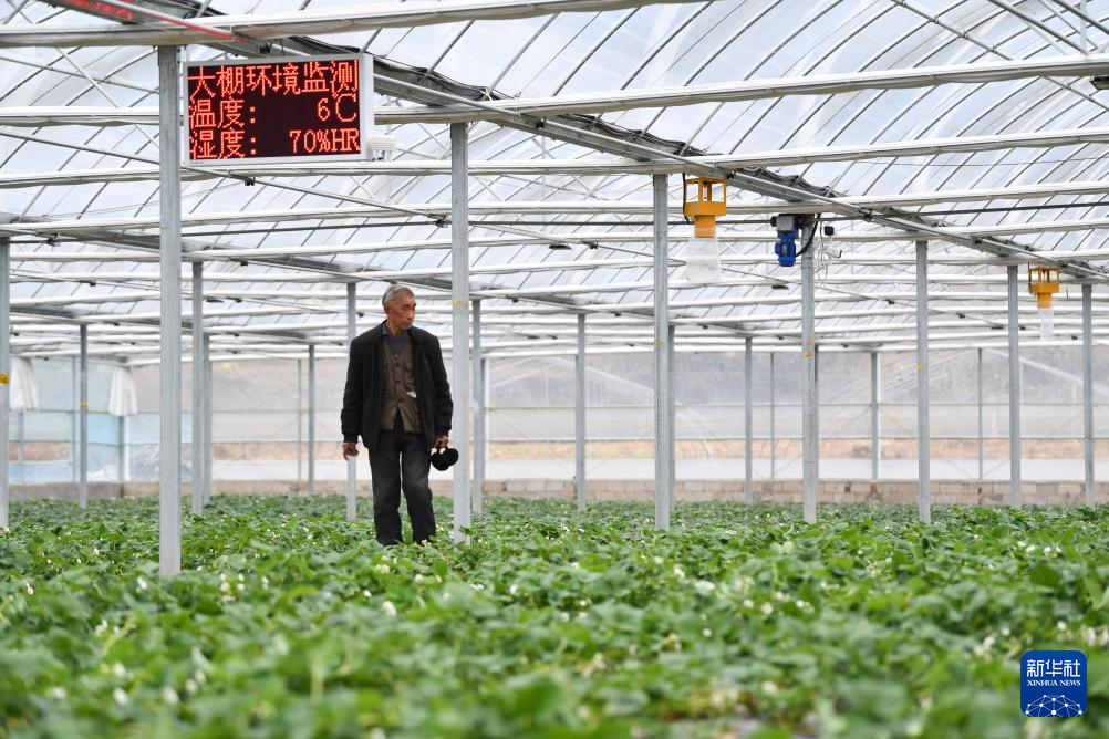 12月29日,在陕西省镇巴县长岭镇现代农业示范园,工作人员在大棚查看草莓长势。