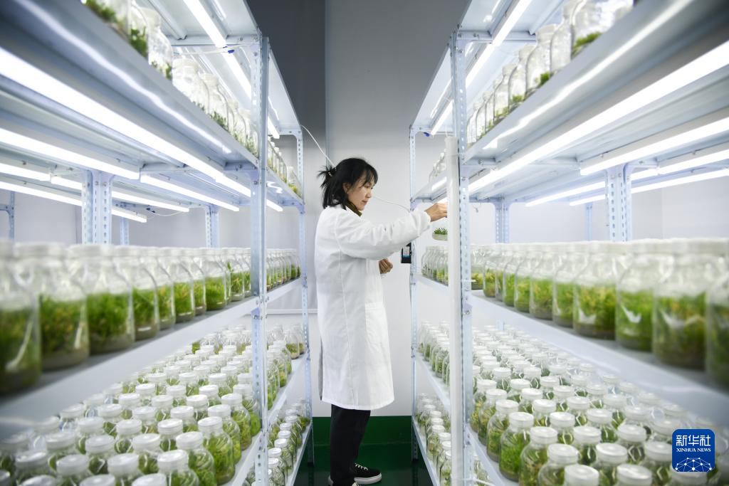 12月29日,在陕西省镇巴县长岭镇现代农业示范园,一家中药企业工作人员查看种苗培育情况。