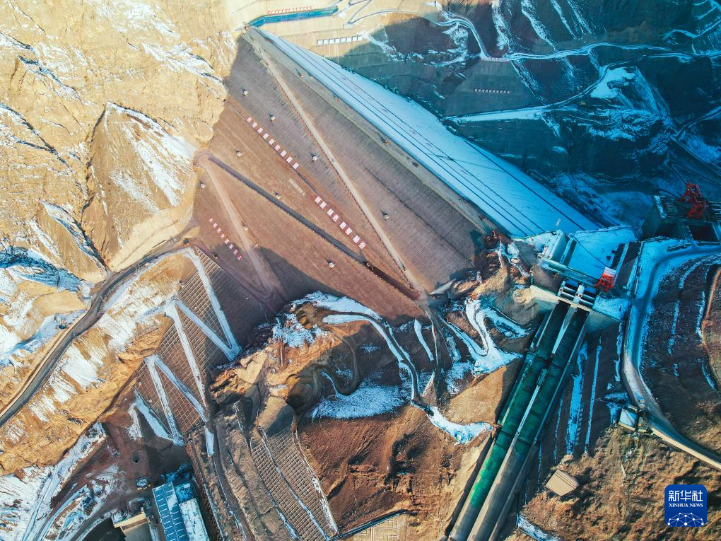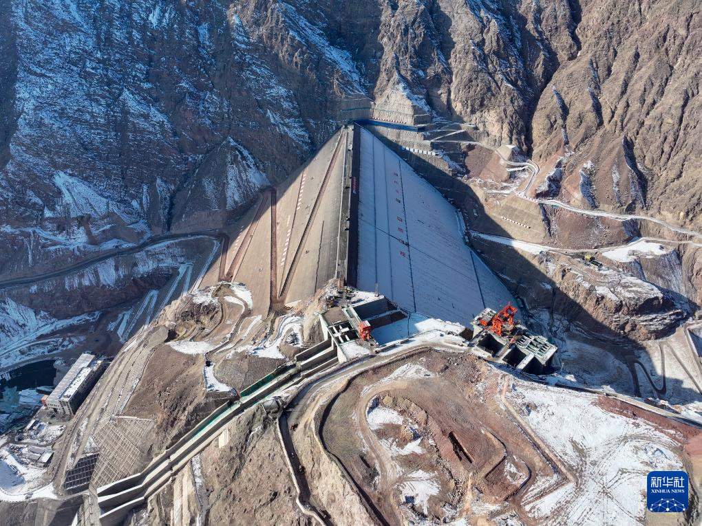 这是12月27日拍摄的新疆大石峡水利枢纽工程大坝项目现场(无人机照片)。