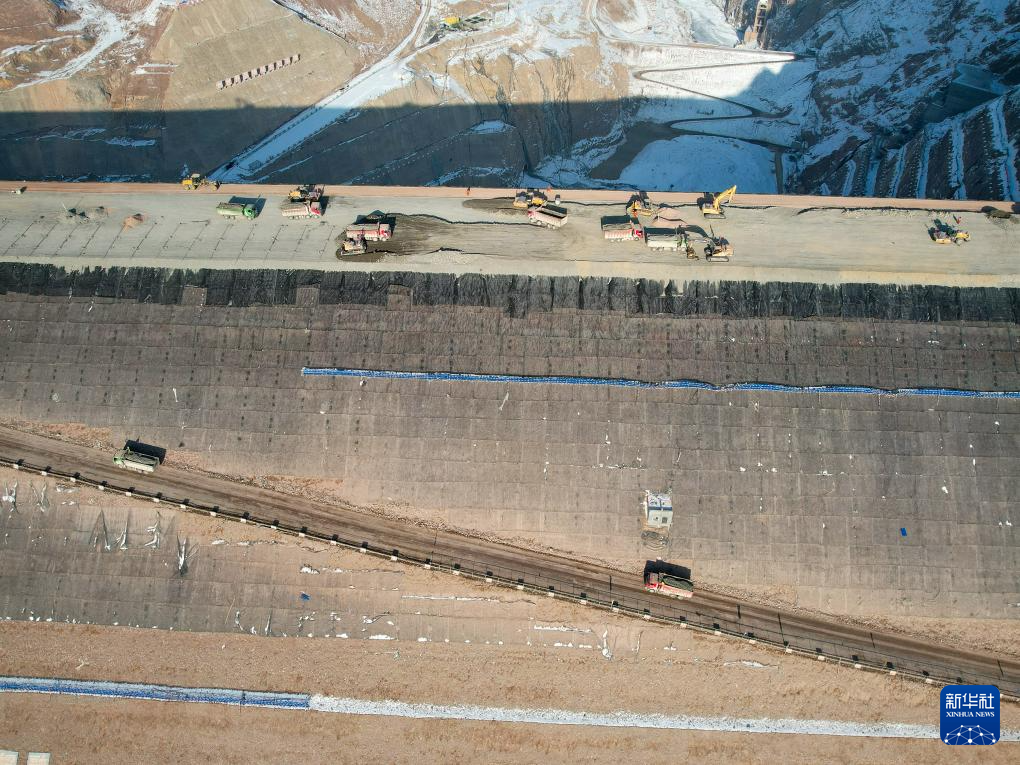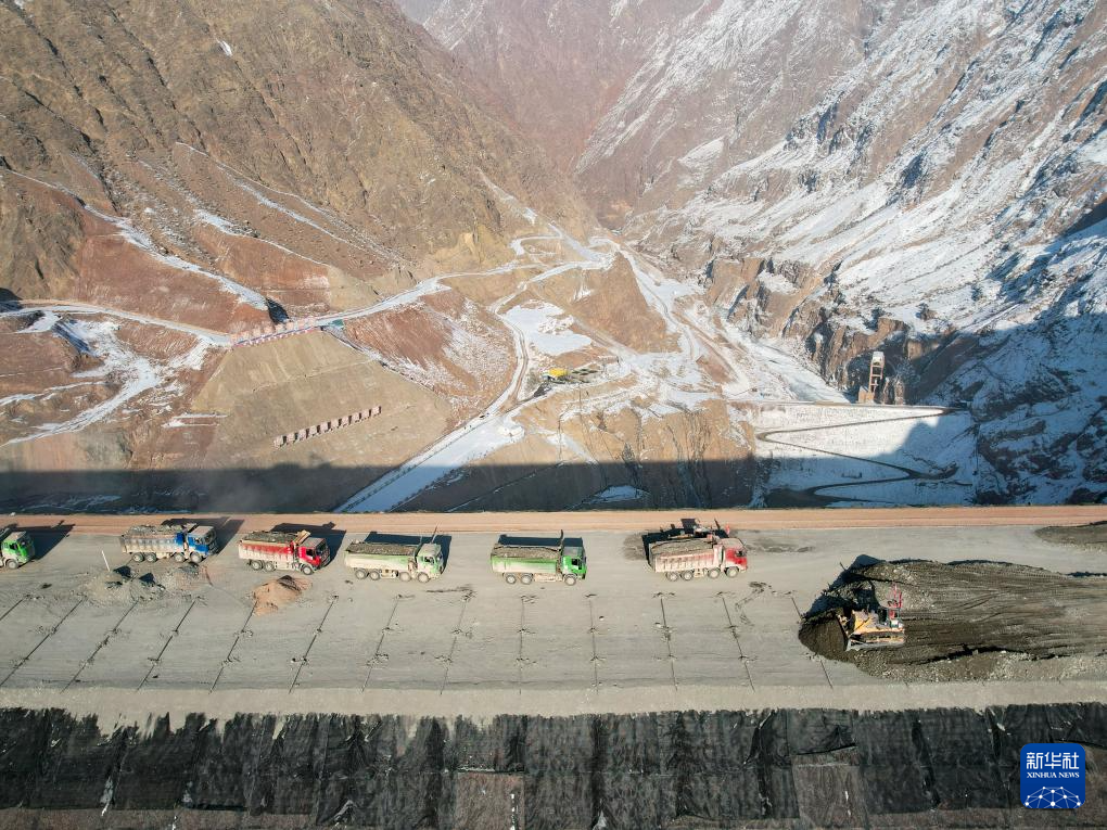 12月27日,工程车辆在新疆大石峡水利枢纽工程坝顶施工(无人机照片)。