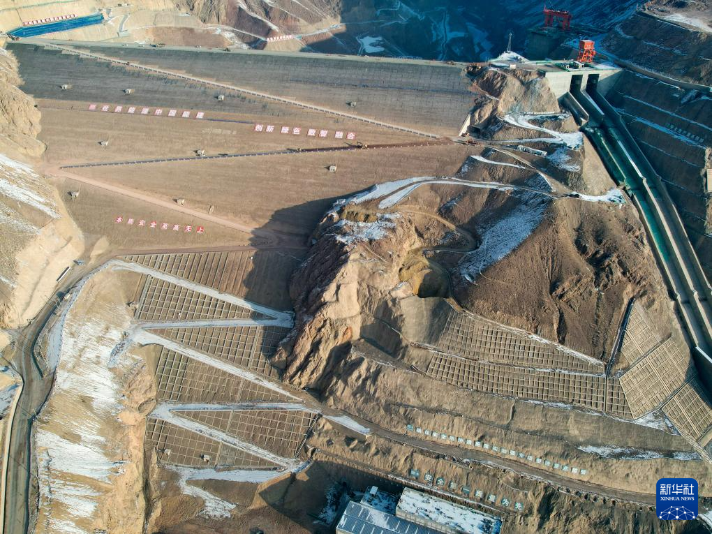这是12月26日拍摄的新疆大石峡水利枢纽工程大坝项目现场(无人机照片)。