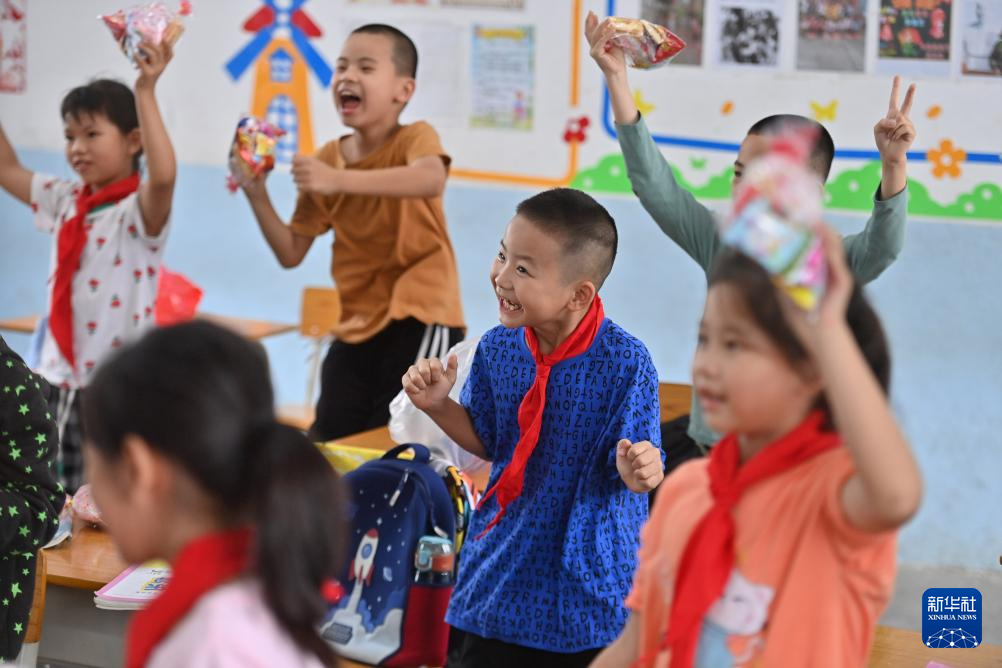 2024年5月31日,在觉山教学点,孩子们在领取儿童节礼物。