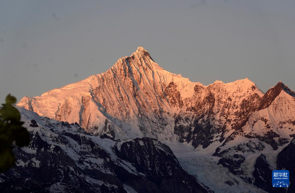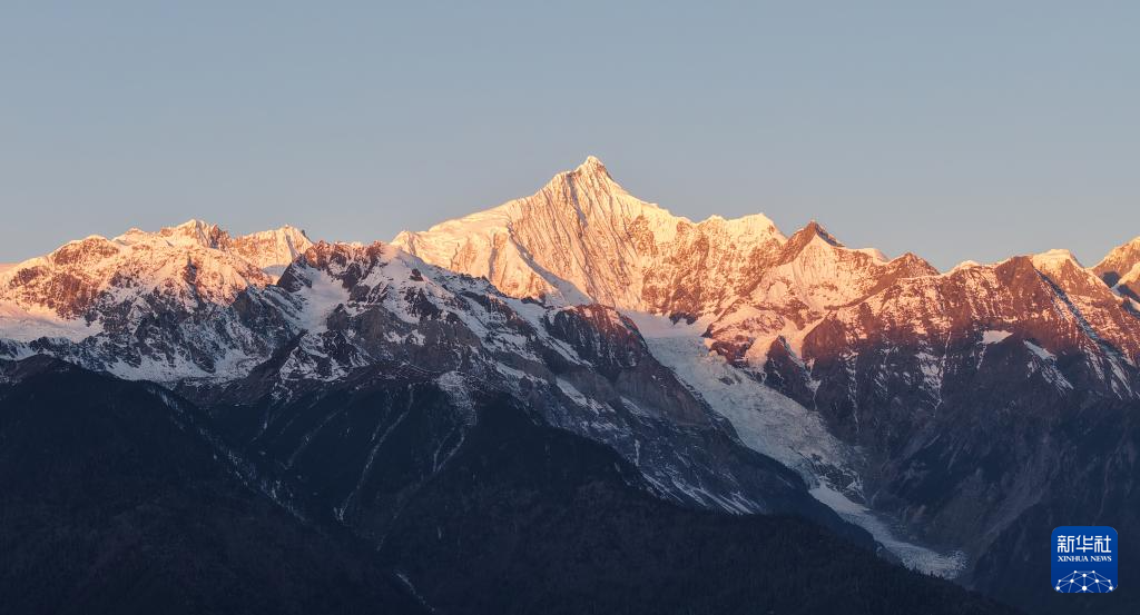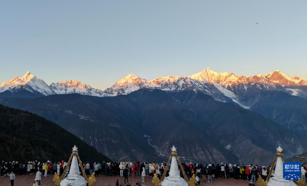 隆冬时节,云南省迪庆藏族自治州德钦县的梅里雪山呈现出“日照金山”景象,吸引了众多游客前来观赏。