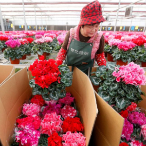 1月5日,在山东省青岛市即墨区灵山街道百亿绿洲花卉种植基地,花农在整理花卉。