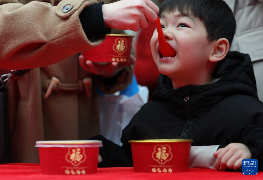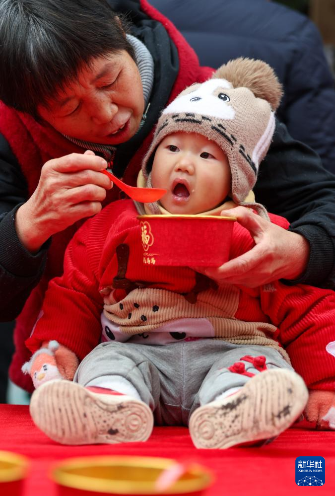 1月7日,家长在阆中古城喂小朋友吃腊八粥。