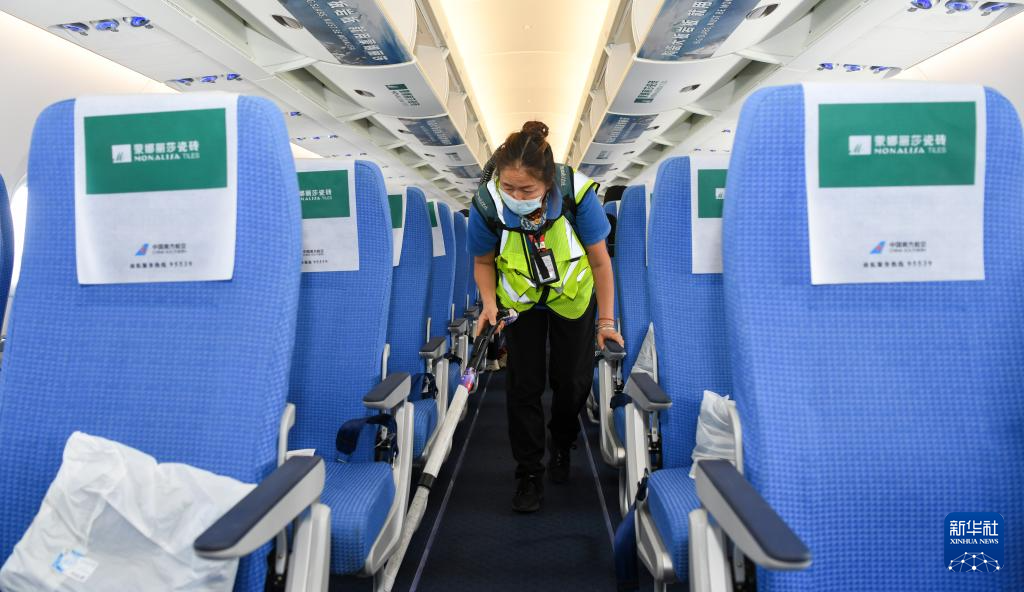1月10日,三亚凤凰国际机场,南航勤务人员在国产大飞机C919上做清洁。