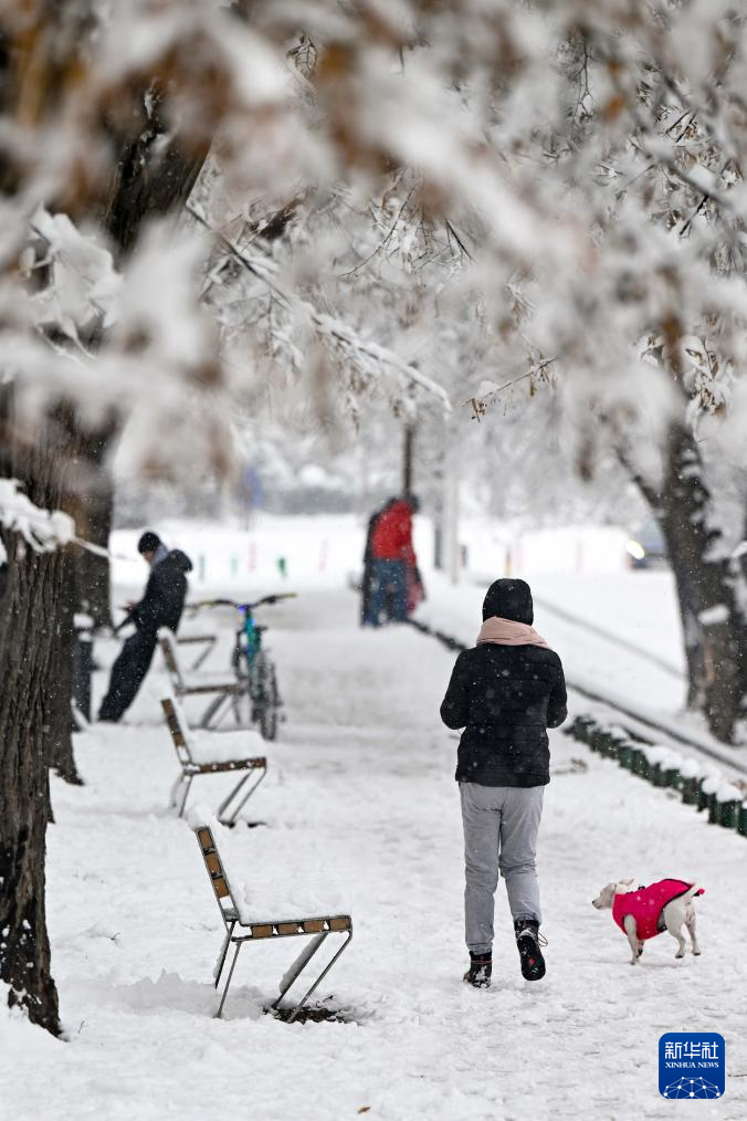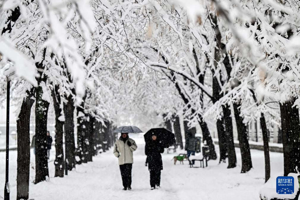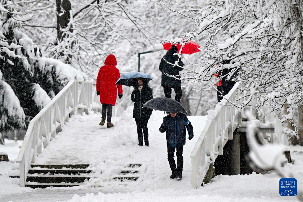 1月12日,在北马其顿首都斯科普里的城市公园,人们欣赏雪景。