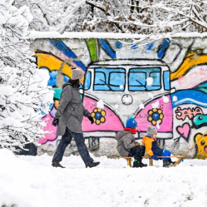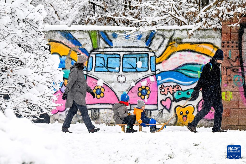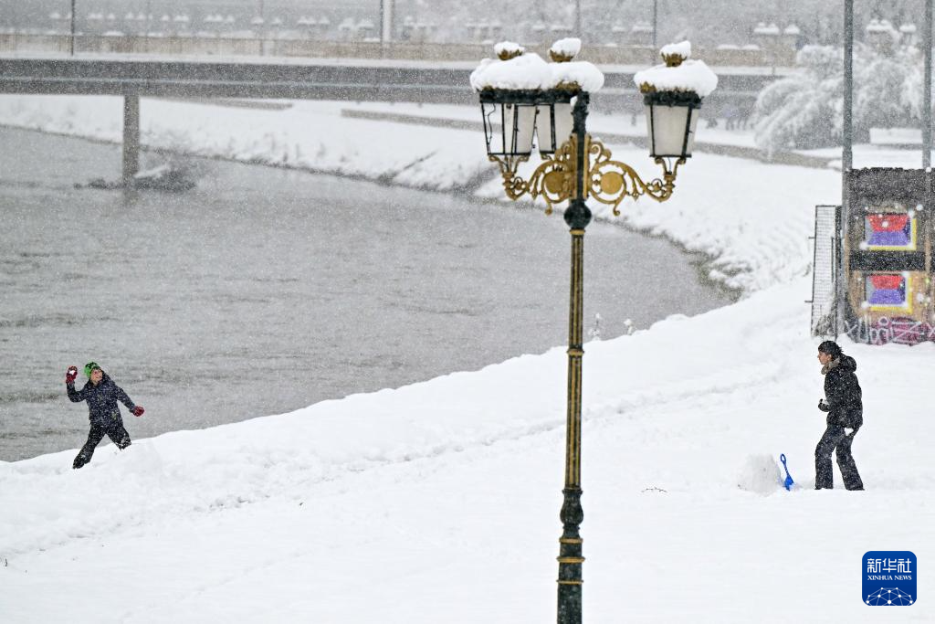 1月12日,在北马其顿首都斯科普里的城市公园,人们在雪中玩耍。