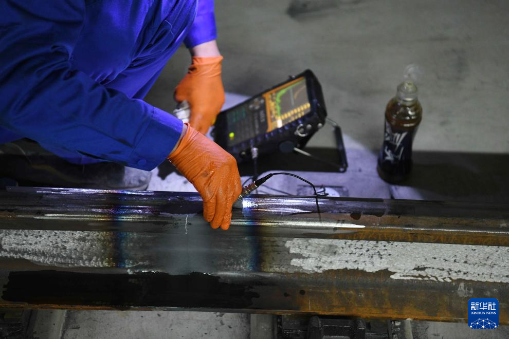 1月18日,中铁五局建设者在合肥新桥机场S1线正线轨道铺设焊轨施工现场进行探伤作业。