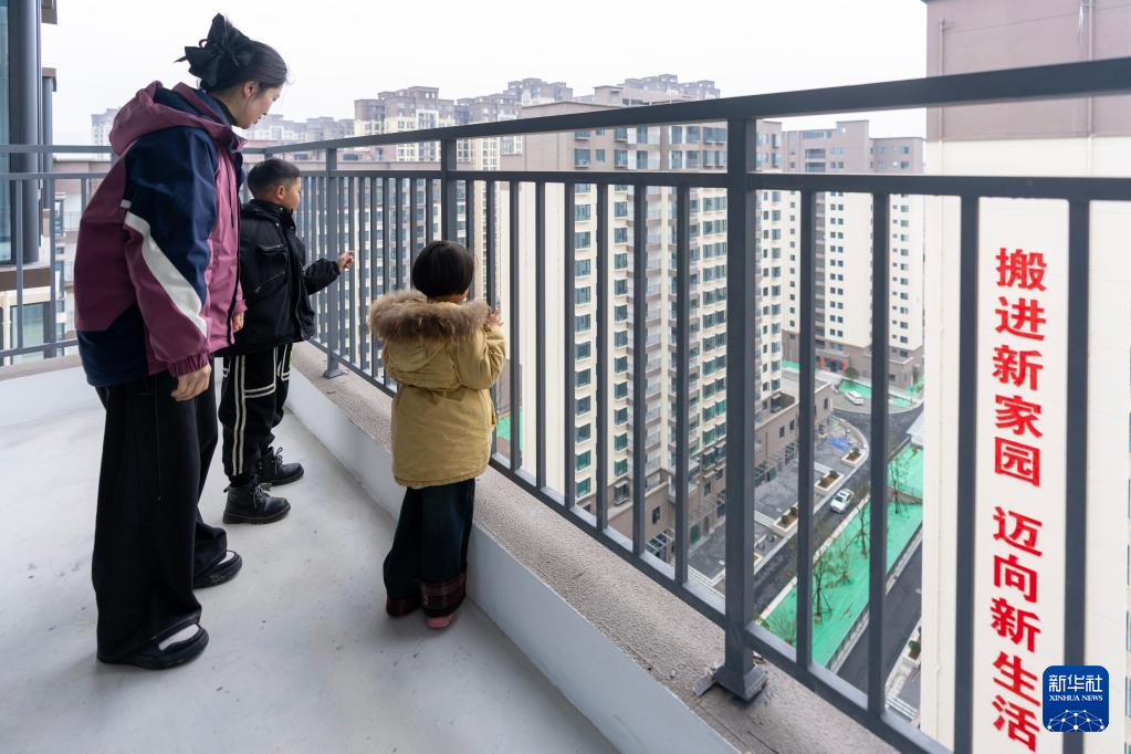1月16日,村民和孩子在新家阳台上俯看小区。