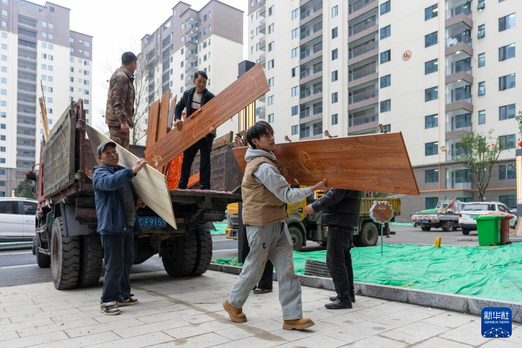 1月17日,受灾村民搬运家具准备入住雄俊园小区的新家。