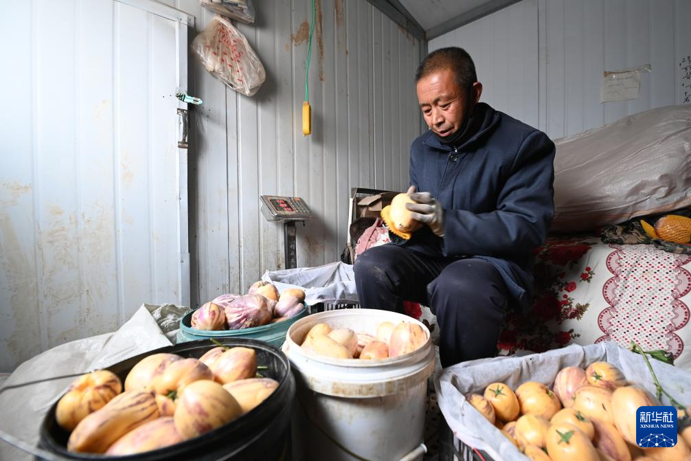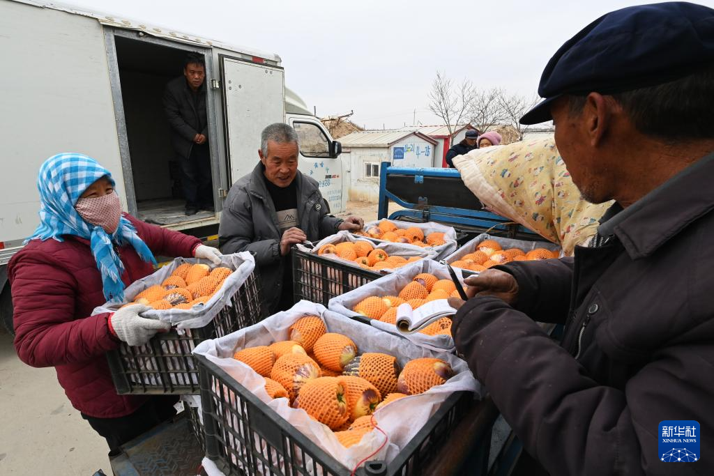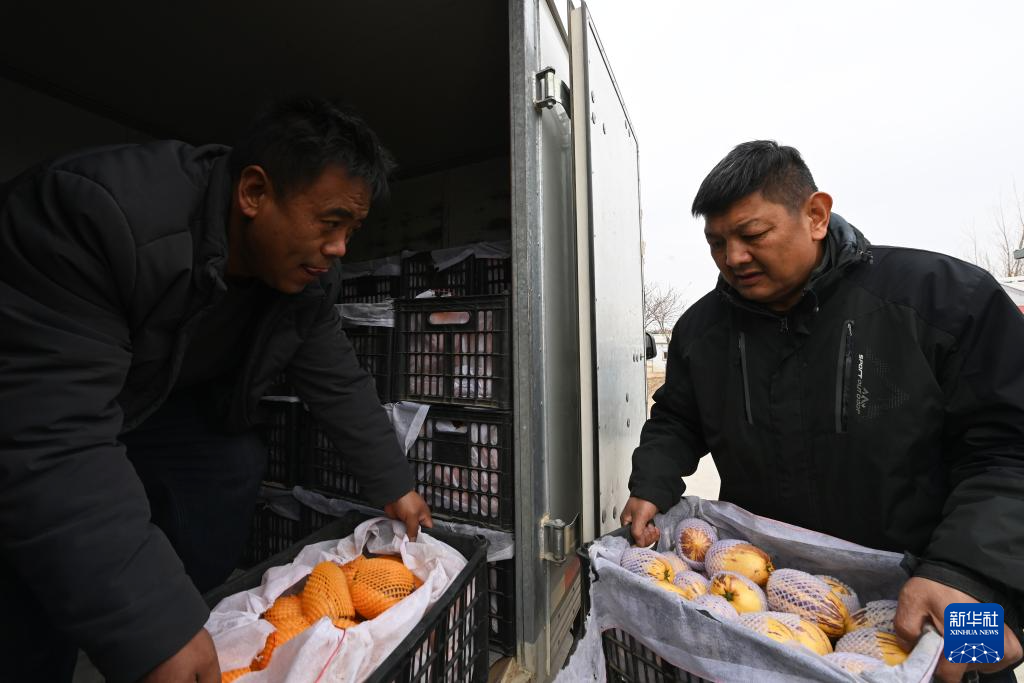 1月17日,在古浪县现代丝路寒旱农业示范基地,村民将采摘的人参果卖给收购商。