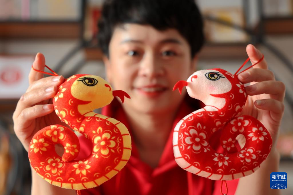1月21日,山东省滨州市的手工艺人在展示制作的布艺蛇。