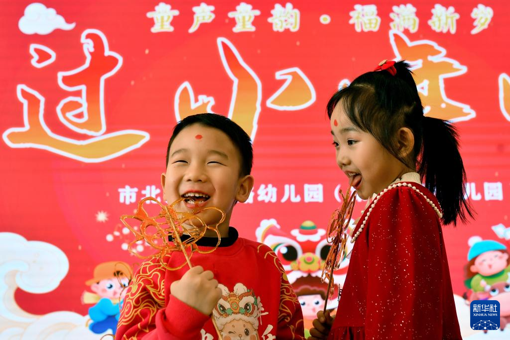 1月21日,在山东青岛高安路幼儿园开展的“学年俗 品年味”主题活动上,两名小朋友在品尝糖画。