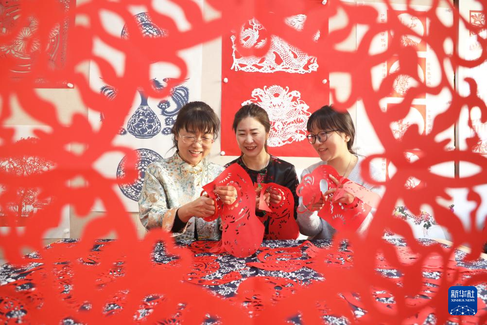 1月22日,在河北省唐山市丰润区太平路街道冀新社区,剪纸艺人葛英(左)在教居民创作生肖蛇剪纸作品。